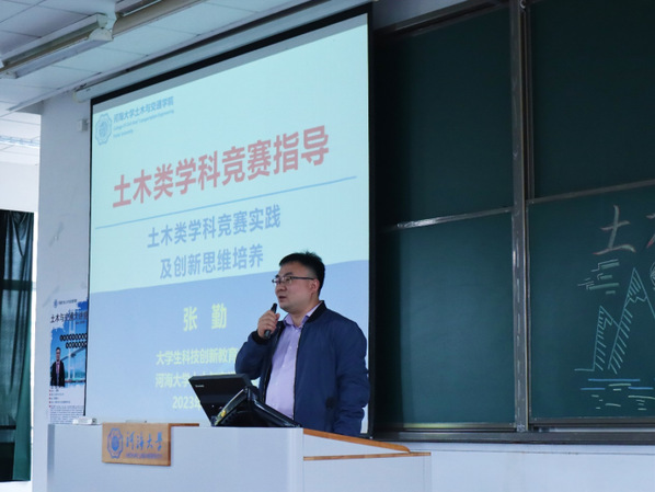 紧接着,张勤老师向同学们介绍了美国土木工程师学会和加拿大土木工程学会在世界上的影响力,并列举出近年来各项土木类国际竞赛的举办情况以及河海大学在各类相关竞赛上所取得的优异成绩。随后,张勤老师以2023年全国大学生结构竞赛校内选拔赛为例,鼓励同学们积极参与竞赛,全力以赴去赢得比赛,体验比赛过程中的艰辛、劳累和汗水,方能感受“奋斗是青春最靓丽的底色”的真谛,不负学校的期待。