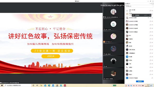 各级团支部于2023年4月18日至4月24日期间开展以“提高保密意识,强化保密观念”为主题的团日活动。各团支部活动形式多样、内容丰富,以团员青年喜闻乐见的方式提升大家的保密能力,进一步增强同学们的保密意识。2020级交通一班团支部于4月20日在线上开展了以“讲好红色故事,弘扬保密传统”为主题的团日活动。同学们通过观赏《保密防线》等保密公益宣传视频,回顾国家保密法治发展历程,了解周恩来、邓颖超、钱学森等楷模保卫国家秘密的故事,激励团员共同守护国家安全。