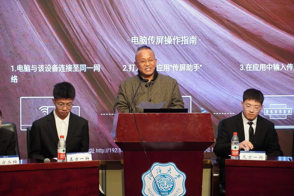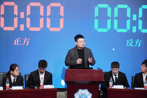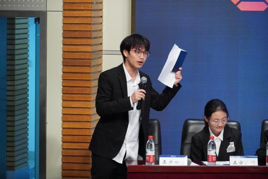 比赛开始前,主持人介绍了参赛评委,两院辩手也进行了自我介绍。比赛开始,正方一辩邹彦博首先进行立论陈词,提出学以致知可以理解成为了获得知识而学习,而学以致用则是更关注知识的应用与实用性,而不论是从个人层面还是社会层面,知识的应用与实用性都更有意义,因此学以致用是更值得提倡的态度。我方二辩张佳萌从兴趣入手展开质询,提出了社会心理学领域的扛鼎人物——卡罗尔德韦克博士提出的两种兴趣内隐观,分别是固定兴趣观和成长兴趣观。基于这两种兴趣观,紧跟正方一辩进行有效的论述。